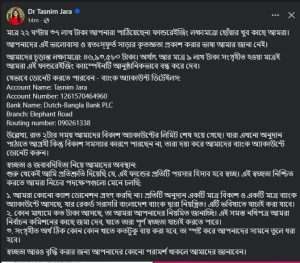 মাত্র ২২ ঘণ্টায় ৩৭ লাখ টাকা আপনারা পাঠিয়েছেন! ফান্ডরেইজিং লক্ষ্যমাত্রা ছোঁয়ার খুব কাছে আমরা। আপনাদের এই ভালোবাসা ও স্বতঃস্ফূর্ত সাড়ার কৃতজ্ঞতা প্রকাশ করার ভাষা আমার জানা নেই। আমাদের চূড়ান্ত লক্ষ্যমাত্রা : ৪৬ লাখ ৯৩ হাজার ৫৮০ টাকা। অর্থাৎ আর ৯ লাখ টাকা সংগৃহীত হওয়া মাত্রই আমরা এই ফান্ডরেইজিং ক্যাম্পেইনটি আনুষ্ঠানিকভাবে বন্ধ করে দেব।যেভাবে ডোনেট করতে পারবেন, ব্যাংক অ্যাকাউন্ট ডিটেইলস Account Name : Tasnim Jara Account Number : 1261570464960 Bank Name: Dutch-Bangla Bank PLC Branch: Elephant Road Routing number : 090261338