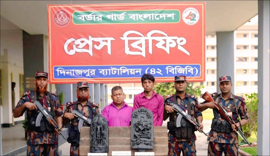 দিনাজপুরের চিরিরবন্দরে বিজিবি ও পুলিশের যৌথ অভিযানে পাচারের আগেই উদ্ধার করা হলো দুষ্প্রাপ্য কষ্টিপাথরের মূর্তি ও মূল্যবান বেলে পাথরের শীলা। এই ঘটনায় দুই পাচারকারীকে হাতেনাতে আটক করা হয়েছে।
